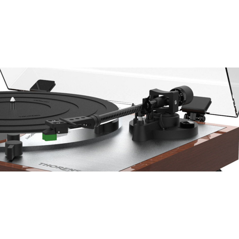 El nuevo tonearm Thorens TP 72 utiliza un tubo de carbono, el cartucho AT VM95 E preinstalado está montado en un casco desmontable. El preamplificador phono integrado puede desconectarse en caso necesario.