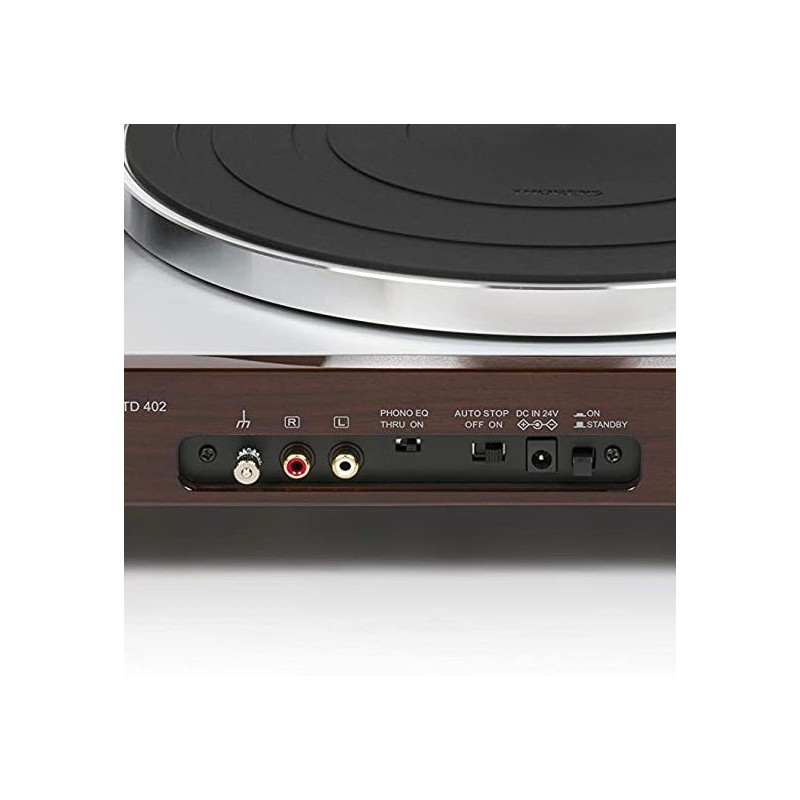 El TD 402 DD es un giradiscos de estética clásica con unas características muy innovadoras; motor de tracción directa (preciso y silencioso), apagado automático cuando el disco llega a su fin, brazo de lectura TP 72 con cuerpo de carbono, porta-cápsulas intercambiable, cápsula AT, plato suspendido y previo de phono MM...