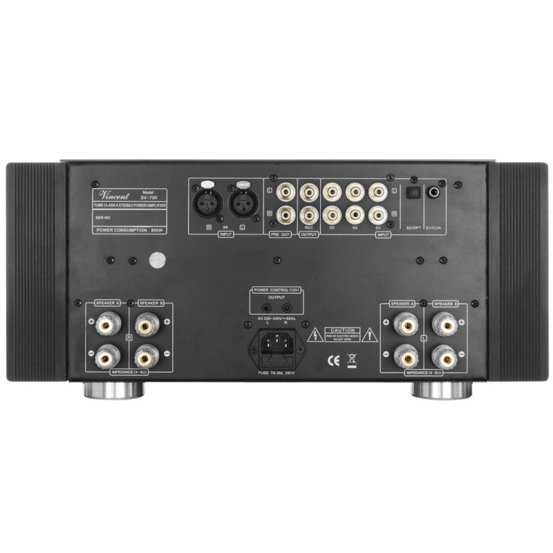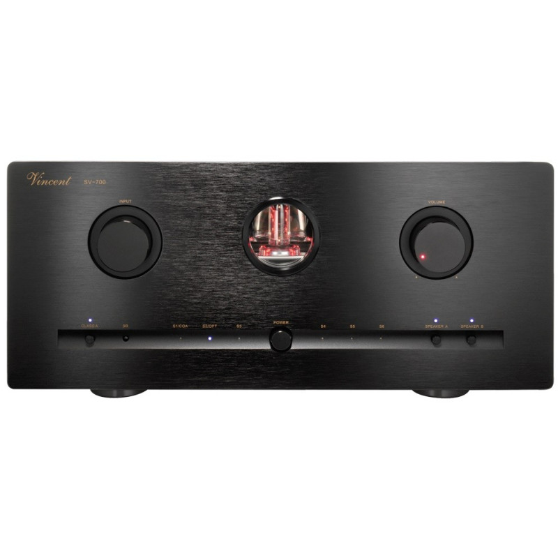 SV700 Amplificador Integrado Hibrido Valvulas: 1 x 6Z4, 2 x 12AX7, 4 x 12AU7 Potencia: 2x160W RMS a 4Ω / 2x100W RMS a 8Ω / 2x50W RMS a 8Ω Clase A Conexiones Entrada: 3 RCA + 1XLR + 1 Optico+1Coaxial. Conexiones Salida: RCA REC, Pre-out, Altavoces A+B Dimensiones:430x192x430 Peso 24,2 kg.