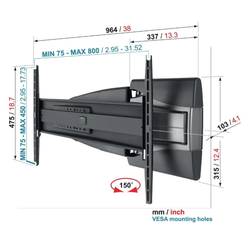 Vogels EFW8345 Soporte de TV con rotación de 150º | Modo perpendicular a la pared (90°) | TVs de 32 a 55 pulgadas | Orificios de montaje VESA: 75 x 75 mm hasta 800 x 450 mm