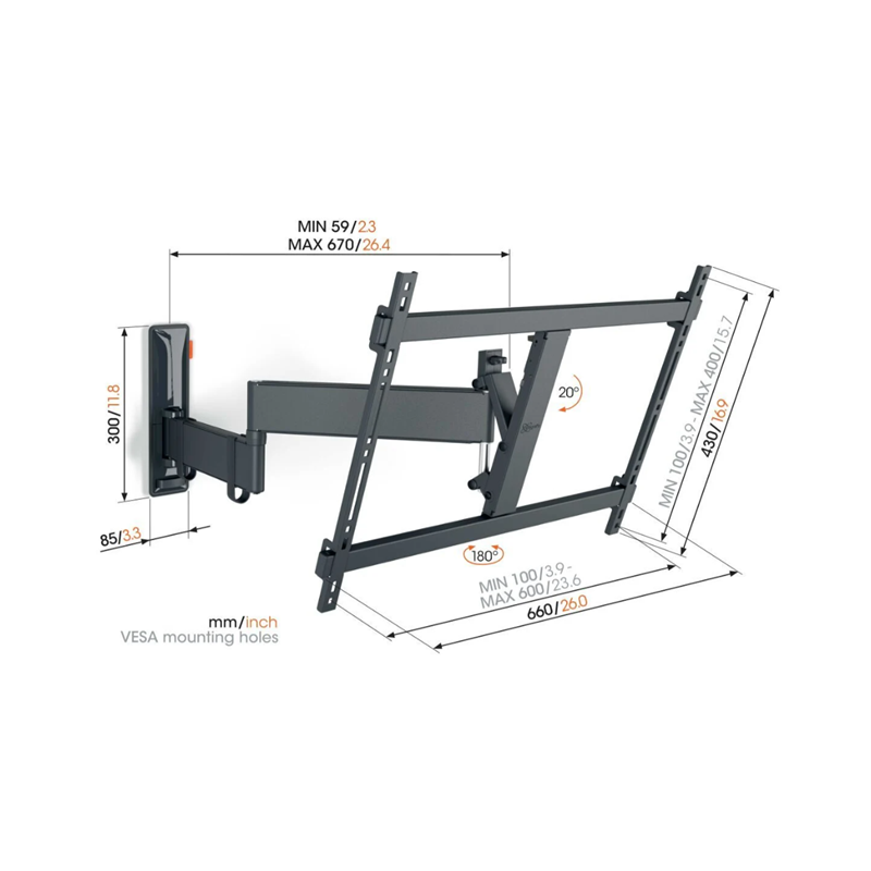 Con este elegante soporte de pared para TV COMFORT Full-Motion+, podrás disfrutar al máximo de tu televisor de gran tamaño. El soporte de pared puede girar hasta 180° e inclinarse hasta 20° para una óptima comodidad de visualización. Está diseñado para un uso intensivo, por lo que es ideal para familias con niños. Está garantizado el montaje de tu televisor de manera segura y firme. El soporte de pared es apto para TV de entre 40 y 77 pulgadas con un peso de hasta 35 kg.