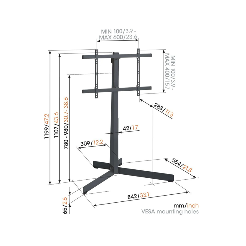 Vogels TVS 3690 soporte de pie TV | Tamaño min/máx pantalla: 40"-77" | Mira la TV desde cualquier parte de la habitación | Gira hasta 90° | Oculta los cables en la parte trasera del soporte | Carga máx: 50 kg | Opcional: TVA 6400 soporte para centro multimedia