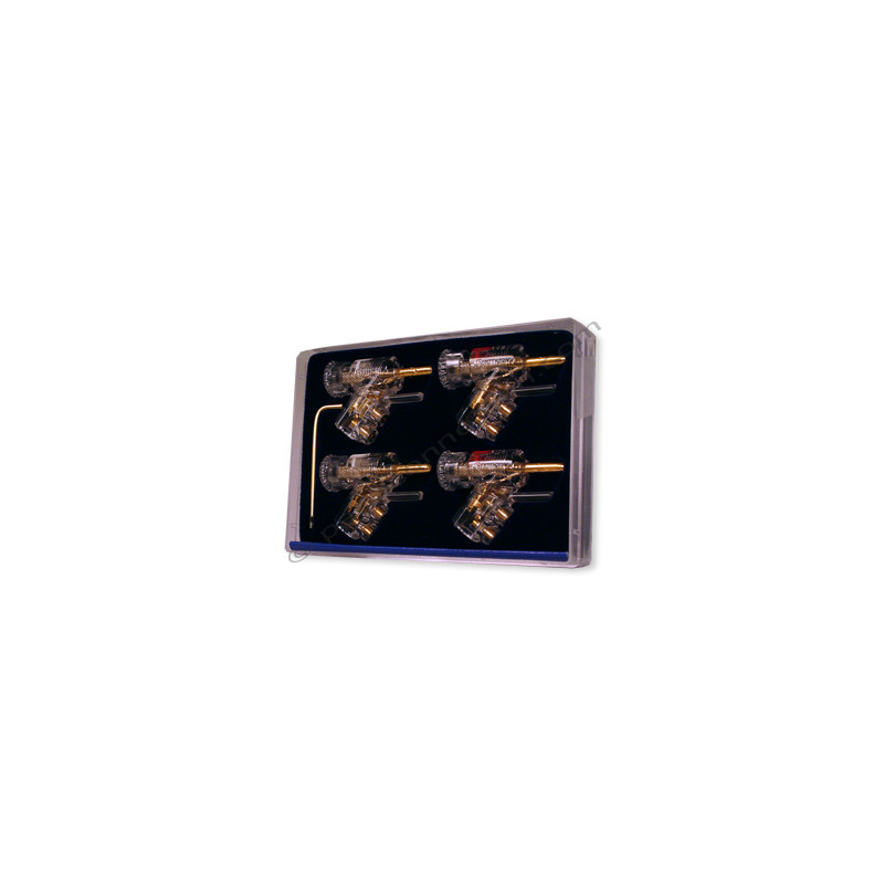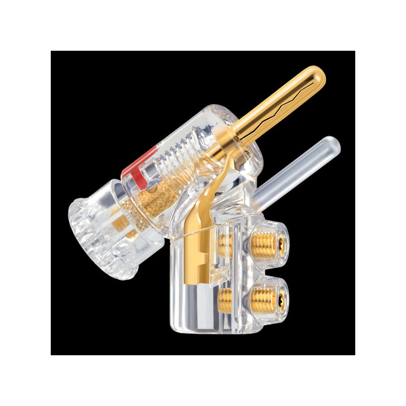 Conector tipo banana acodada con sistema de auto-anclado a hembra, chasis aislante de Makrolon y contactos de cobre puro chapado en oro de 24 kilates, compatible con cableados de hasta 10mms de sección, fijación por doble tornillo Torx.