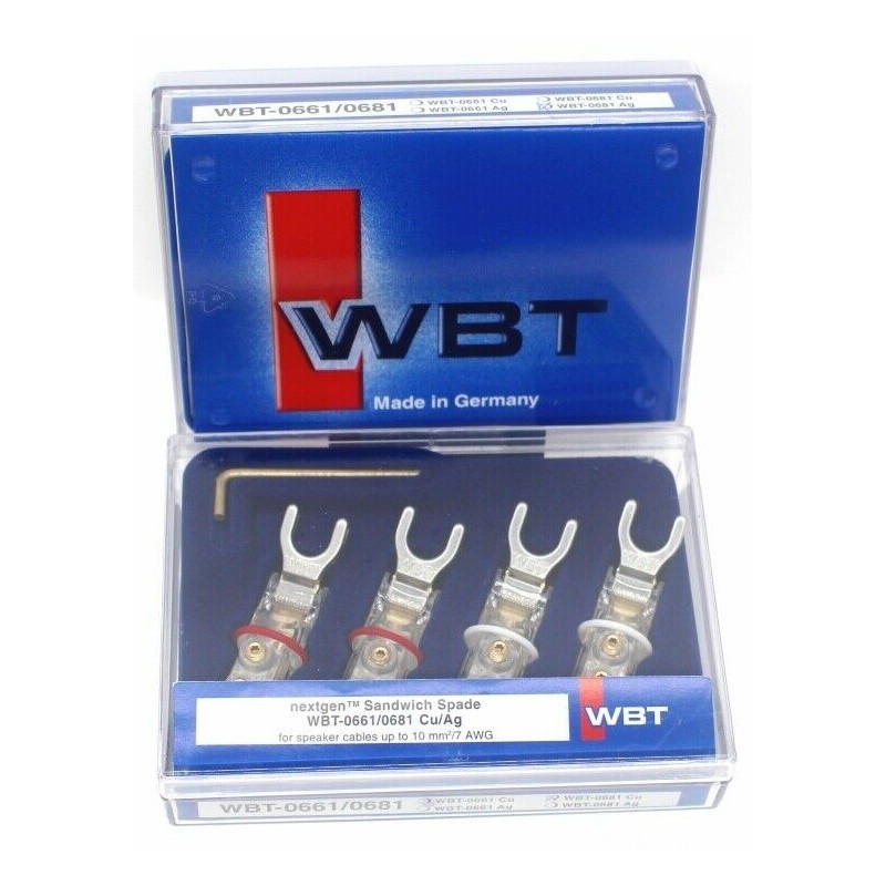 Era el turno de que las acreditadas spades de sándwich de WBT se sometieran a una actualización muy especial de "nueva generación". Los conductores de señal (de las versiones Ag) siempre se han construido con plata fina y su construcción ya se basaba en el principio de masa mínima. La novedad es que el cuerpo base de la pala representa ahora una construcción casi sin metal para convertirse en un conector 100% nextgen. Sin duda, ¡disfrutará de un rendimiento sonoro mucho más detallado y espacioso de su equipo HiFi!