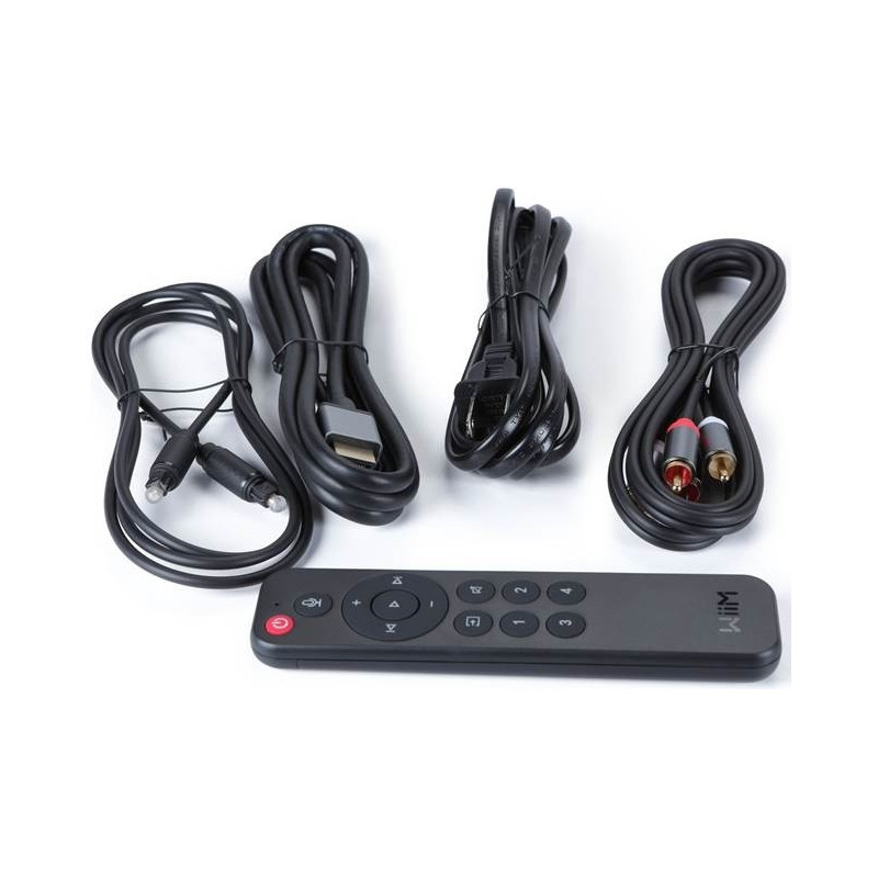 Accesorios incluidos: Mando de voz WiiM, cable HDMI, cables de audio RCA y óptico.