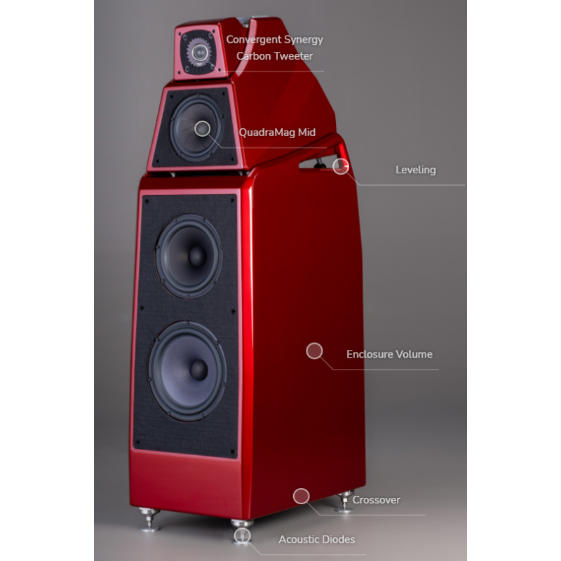 La integración del tweeter y los medios es un elemento absolutamente crítico para la reproducción precisa del sonido. Originalmente, cuando se introdujo la Serie 2 de Alexia, se utilizó la misma unidad de rango medio de fibra de celulosa/compuesto de carbono que se encuentra en el WAMM Master Chronosonic. Este rango medio ha servido bien a Alexia a lo largo de los años. Después de una extensa experimentación y refinamiento del sistema, el Alnico (Aluminio-Níquel-Cobalto) QuadraMag ha sido incorporado con éxito en el diseño y seleccionado como el principal rango medio para el Alexia V. Desarrollado por primera vez para el Chronosonic XVX, el rango medio QuadraMag proporciona un sonido rico y real.