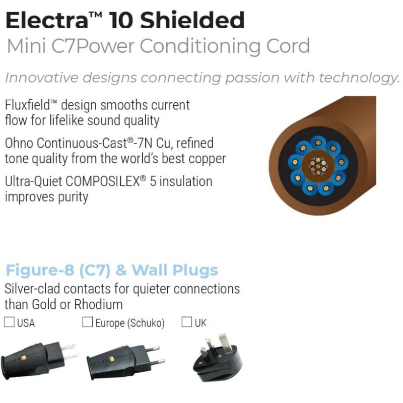 El minicable de acondicionamiento de energía blindado Electra™ utiliza una nueva geometría de conductor para proporcionar un blindaje y aislamiento superiores contra interferencias externas. Este diseño avanzado extiende las funciones y ventajas del acondicionamiento de energía hasta la entrada de alimentación del componente. Con los conductores de cobre OCC-7N más puros del mundo, Electra ofrece el máximo rendimiento en transmisores, altavoces inalámbricos, televisores y barras de sonido. Al funcionar como filtros, las longitudes mayores mejoran el rendimiento.