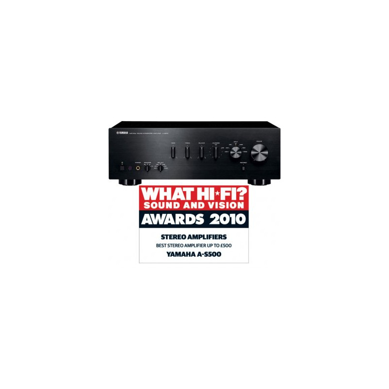 Amplificador Yamaha A-S500. Este modelo supone una sustancial mejora sobre el A-S300. El frontal de aluminio le da una aspecto mas sólido y aumenta la rigidez del producto, además esa rigidez se incrementa con un refuerzo longitudinal que va desde el frontal hasta la trasera del amplificador.