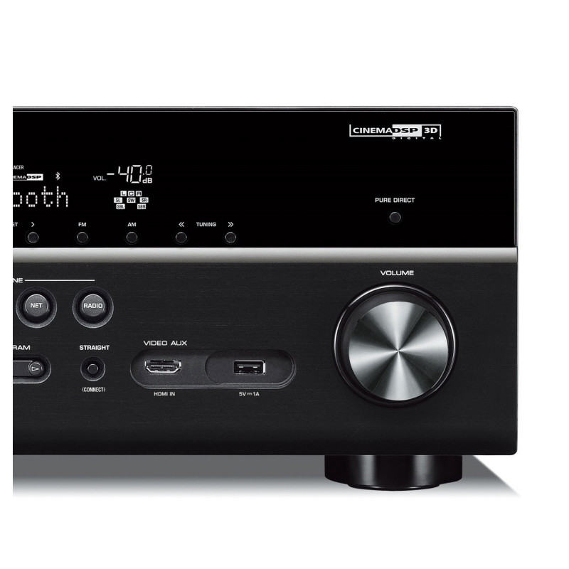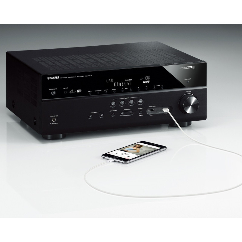 USB. El puerto frontal permite conectar un dispositivo portátil incluyendo la carga de batería.  Todo esto sin pérdida de calidad sonora y además podrás navegar en el dispositivo con el mando a distancia del Yamaha.