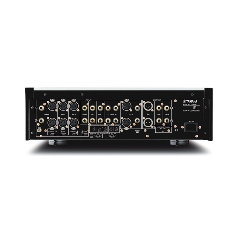 Yamaha C-5000 previo estéreo | Transmisión de señal balanceada | Diseño de baja impedancia | Transformador toroidal doble | Entradas: 6x RCA (4 balanceadas), trigger y remote | Salidas: 3x RCA, 1x balanceada, 2x trigger, 1x remote, auriculares