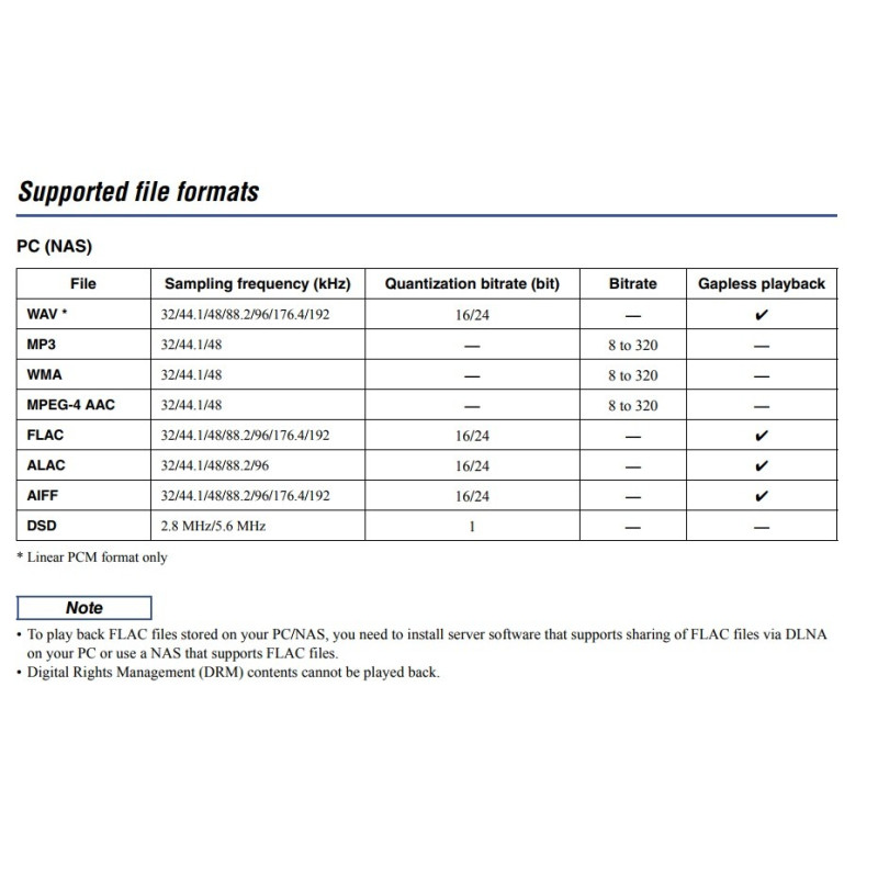 - Formato de archivo MP3, WMA, MPEG4 AAC, WAV, FLAC, AIFF, ALAC, DSD